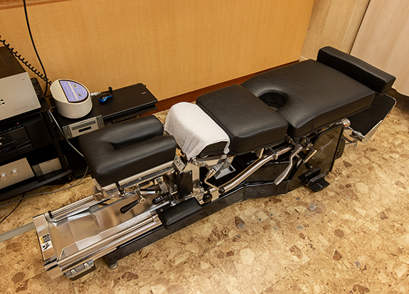施術室設置されているベッドは、頭部の位置や胸部・腹部の角度、高さなどを自在に動かすことができる電動式のカイロプラクティック専用のものです。
