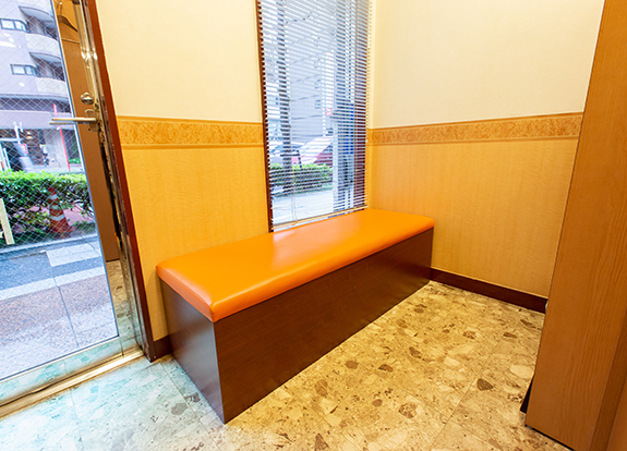 待合室と受付には、オレンジを基調とした明るい雰囲気でリラックスして施術を受けられます。