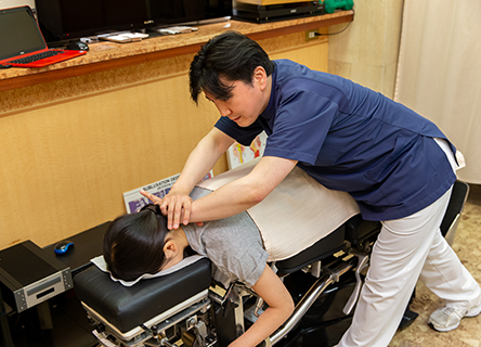 10~70代の方まで幅広くお越しいただいています。中でも、デスクワークをされている40代前後の方が多いです。一旦、痛みや不調が緩和されても、日々の生活習慣やお仕事などで、不調を繰り返す方もいらっしゃって、調整のために定期的に通われている方が少なくありません。また、現代社会の大きな問題とも言えますが、スマホやパソコンなどの機器を若いうちから扱うため、小中高生でも姿勢を調整するために通われることが増えています。ストレートネックのため、肩こりや首こりに悩むお子様もいらっしゃいます。