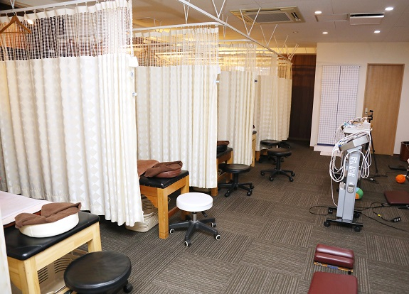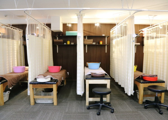 当施設ではお客さまにリラックスして施術を受けていただけるように、開放感を意識した広い施設内を落ち着いた雰囲気でまとめております。また、足を痛めているお客さまでも移動しやすいように、施設内では靴を脱いでいただき素足で移動していただくようにしております。