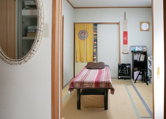 入口の土間のようなスペースは、自分たちでタイルを貼り手作りしました。奥の部屋は完全個室の和室で、アットホームな癒しの空間になっております。音楽・アロマ・畳で、和のリゾートでマッサージを受けているようだと、言われることもあります。